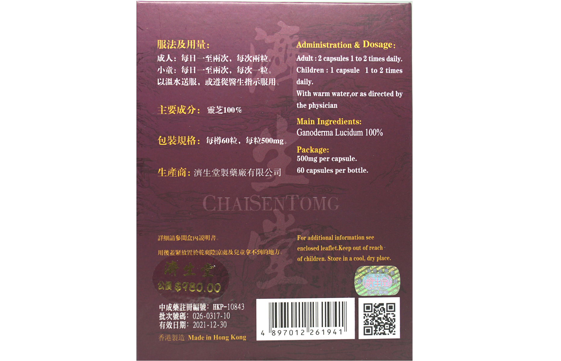 濟生堂純靈芝,有益氣強壯,養心安神,止咳平喘,健脾胃之功效。